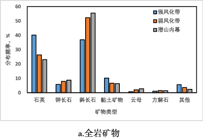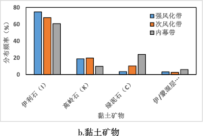研究区纵向上自强风化带到内幕带:长石与云母矿物相对含量逐渐升高,石英、黏土矿物相对含量逐渐降低;绿泥石与伊蒙混层相对含量逐渐升高,黏土矿物中伊利石与高岭石相对含量逐渐降低(图 5)。