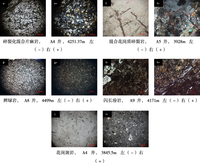 据刘鹏程对渤海湾太古界岩性研究,本研究区岩石类型包括经混合岩化作用形成的混合岩类,即浅色体含量大于85%的混合花岗岩、浅色体含量在50%~85%的混合片麻岩以及浅色体矿物含量小于50%的混合岩化片麻岩;区域变质作用所形成的表壳岩类中的变粒岩/浅粒岩;动力变质作用形成碎裂岩类;和不同阶段岩浆作用形成的侵入岩类所组成的杂岩体,如基性的辉绿岩,中性的闪长玢岩和酸性的花岗斑岩[10-12]通过对研究区319块铸体薄片的鉴定表明,储层岩性主要为混合花岗岩、碎裂化混合花岗岩和混合花岗质碎裂岩和少量混合片麻岩、变粒岩及碎裂化混合片麻岩等变质岩及辉绿岩、花岗玢岩及闪长玢岩等侵入岩(图1、图2)。
