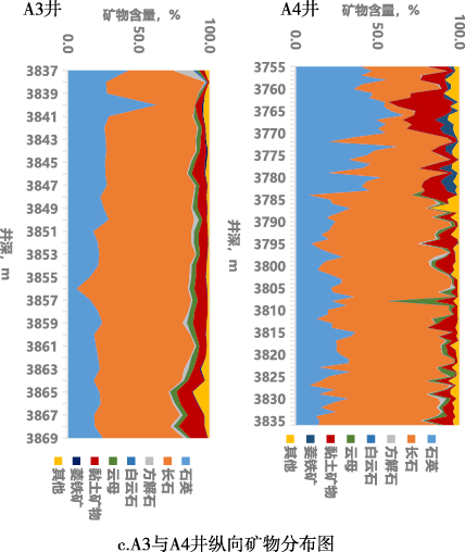Figure 5 Histograms of mineral and clay mineral distribution in different zones and vertical mineral distribution maps of single wells
