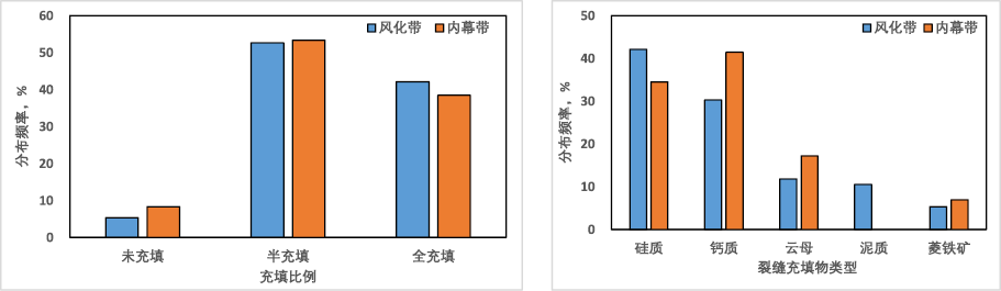 从风化带到内幕带全充填缝占比降低3.8%,半充填缝增加0.8%,未充填缝占比增加3%;裂缝充填物中硅质含量降低7.6%,钙质含量增加11.1%,云母含量增加6.4%,菱铁矿含量增加1.6%,如图13所示。