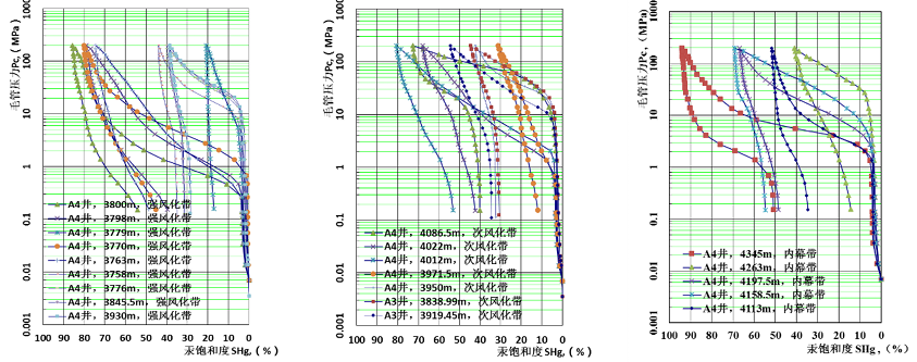(3)研究区为孔隙—裂缝型储层,储集空间类型包括孔隙与裂缝,通过压汞实验可知,研究区孔喉结构较差,自强风化带到内幕带,孔喉半径减小,排驱压力变大,孔喉结构逐渐变差。