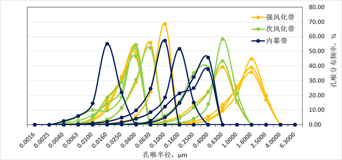 通过对研究区岩心进行常规压汞实验得出(图8、表2):强风化带压汞曲线细歪度,分选性极差,Rmax、RA、R50、Rc平均值分别为1.09、0.22、0.16、0.19μm,退汞效率平均值为32.71%,分选系数平均值为2.66;次风化带压汞曲线呈细歪度,分选性极差,Rmax、RA、R50、Rc平均值分别为0.42、0.09、0.02、0.04μm,退汞效率平均值为38.60%,分选系数平均值为2.19,孔喉结构品质次于强风化带;内幕带压汞曲线细歪度,分选性极差,Rmax、RA、R50、Rc平均值分别为0.30、0.08、0.04、0.06μm,退汞效率平均值为38.53%,分选系数平均值为1.82,孔喉结构品质最差。总体来说纵向上从强风化带到内幕带,孔喉半径变小,排驱压力变大,孔喉结构变差。