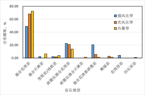 研究区纵向上自强风化带到内幕带:岩石类型中混合花岗岩相对含量逐渐升高,而碎裂化混合花岗岩与混合花岗质碎裂岩相对含量逐渐降低(图 3)。