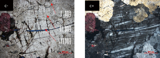 Ⅰ期石英充填,Ⅱ期钙质充填,A6井,3936.9m左(-)右(+)