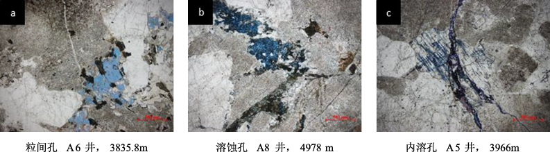 研究区孔隙类型中粒间孔多发育在风化带和动力变质作用强烈的井段,溶蚀孔和晶间溶孔常见于长石、角闪石等易溶矿物中,或粒间、裂缝内的碳酸盐类填隙物溶蚀形成(图7)。