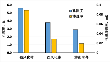 随着深度的增加,风化程度逐渐减弱,储层物性呈变差趋势。从强风化带-次风化带-内幕带,整体上物性呈现逐渐变差的趋势。研究区纵向上自强风化带到内幕带:孔隙度从5.6%降至3.8%再降至2.9%,气测渗透率从0.089mD降至0.0291mD再降至0.0195mD(图6)。