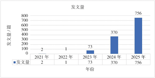 通过对2021—2025年大模型在教育领域应用的相关文献进行计量分析,可以对该主题的研究情况形成整体性认识。下文主要从文献发文量、作者及机构三个方面进行统计分析。