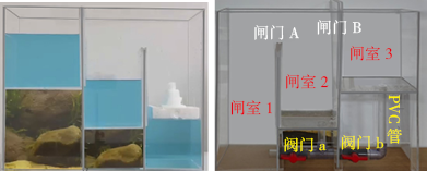 (2)拿出自制船闸模拟教具现场展示,分别向三个闸室中注入适量水,将船只模型放入下游闸室1;打开阀门a,让学生亲眼看到水体从闸室2流向闸室1,液面稳定后,两闸室水面保持相平,顺势提问学生该现象产生的原因;打开闸门A,船只模型顺利进入闸室2;关闭闸门A和阀门a,打开阀门b,直至闸室2、闸室3的水面相平,再打开闸门B,船只模型顺利通过“大坝”到达上游区域。