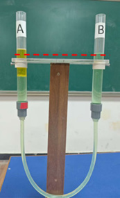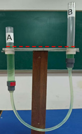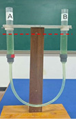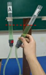 其次保持A管位置不变,调整B管位置,依次改变B管的高度、倾斜度(如图6、图7所示),观察并在表1中记录液面稳定后的实验现象。