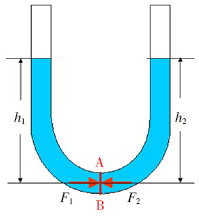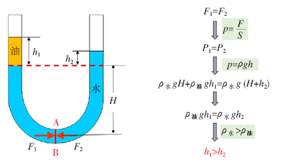 其次进一步引导学生,建立物理模型,运用前面学过的知识分析解释上述实验现象,通过理论分析促使学生深入理解连通器的工作特点,具体过程如下:建立如图9所示的模型,在U形管底部取一假想液片AB,液体稳定时液片处于平衡状态,则F1=F2,由于液片AB面积不变,由p=F/S,可知液片受到左右两边液柱的压强相等,即p1=p2,由液体压强公式p=ρgh,可知h1=h2,则两侧液柱深度相等、液面相平。