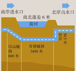 (1)介绍“南水北调工程”,并呈现路线图,引导学生注意中线和东线工程都需跨越黄河。顺势提问:清洁的南方水源是如何“穿过”黄河的呢?让学生集思广益,讨论问题解决方案。