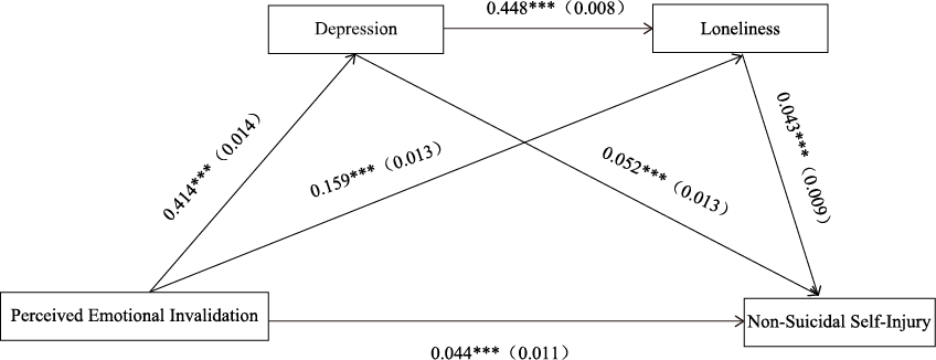 Nock’s integrated model of NSSI suggests that NSSI is an adaptive coping strategy that includes mechanisms related to emotion regulation and interpersonal functioning, focusing on the role of emotion dysregulation and social factors in the development of NSSI. Poorer emotional recovery in university students under high psychological pressure predicted later increases in depressive symptoms (Pea et al., 2016), indicating that perceived emotional invalidation might be a risk factor for depression vulnerability. Depression was found to be related to loneliness and NSSI. Several empirical studies have examined the relationships between depression, loneliness, perceived emotional invalidation, and self-injury. For example, loneliness indirectly affected NSSI via lowered psychological resilience (Zhang et al., 2023). Another study suggested that loneliness might be related to NSSI through processes such as experiential avoidance, supporting the existence of a causal chain in which depression worsens feelings of loneliness (Niu, 2023). In summary, loneliness not only has a direct correlation with self-injurious behaviors but may also have indirect effects by reducing resilience or impeding emotion regulation abilities (Zhang et al., 2023). Therefore, it seems reasonable to assume that depression and loneliness together constitute a serial mediation path between perceived emotional invalidation and NSSI.