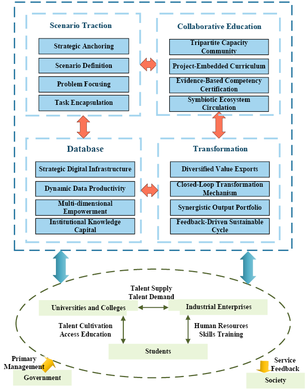 Collaborative Education (C) functions as the competency production line, bridging the gap between scientific innovation and social demand through a knowledge-action integration mechanism. The pedagogical mission of the PSSL is not a secondary supplement to classroom learning but a core mechanism to institutionalize the fruits of industry-education integration. By constructing a competency community involving universities, government, and enterprises, the laboratory injects real-world industrial problems and data into the curriculum, producing combat-ready graduates who understand both social science methodology and industrial logic. This process involves project-based curriculum restructuring and the dual-mentor system, where students tackle real tasks — such as designing a carbon-peaking roadmap for an industrial park — under the guidance of both academic and industry experts. This model solves the fundamental contradiction between theory and practice, creating a reciprocal cycle where enterprises gain early access to high-quality talent and laboratories gain the reputation and industrial feedback necessary for long-term sustainability.