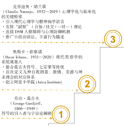 它最初是一种依赖于口传与秘密团体的智慧传承(葛吉夫时期),经由依察诺的系统化编码,转变为一种明确的人格类型学模型。随后,在纳兰霍及其后学者的努力下,完成了关键的“心理学化”与“体系化”过程,从而使其具备了现代学科所要求的可教学性与广泛适用性。