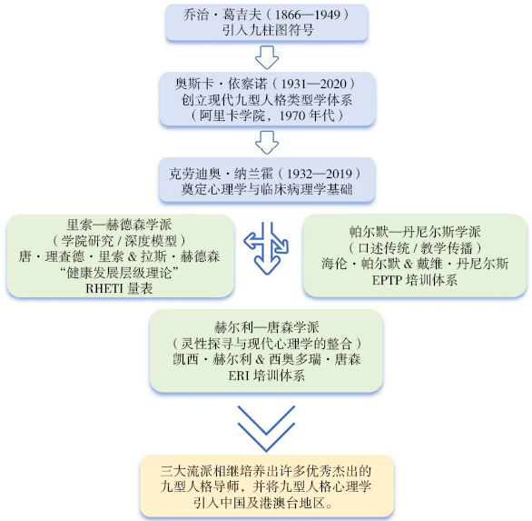 20世纪见证了九型人格从古老的几何符号蜕变为一套成熟人格理论的关键历程。三位人物构成了这一转型的核心链条,为之后里索—赫德森学派与帕尔默—丹尼尔斯学派两大主流方向的形成奠定了理论基础,传承关系如图6所示。
