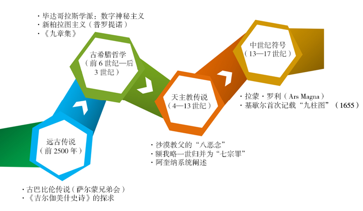 现代九型人格体系的理论内核,深深植根于西方文明的哲学与宗教土壤之中。其关于人性缺陷、转化动力与类型划分的思想,可在诸多古老传统中找到回响,为20世纪现代九型人格体系的建立提供了哲学基础、伦理心理学雏形与符号学先例,如图1所示。