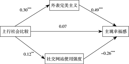 首先,探讨上行社会比较通过外表完美主义和社交网站使用强度影响主观幸福感的中介作用模型是否成立。结果发现,社交网站中的上行社会比较对主观幸福感具有显著正向预测作用(β=0.18,p<0.01)。在此基础上,加入外表完美主义和社交网站使用强度后,结果发现,外表完美主义对主观幸福感具有显著的正向预测作用(β=0.49,p<0.001),社交网站使用强度对主观幸福感具有显著的负向预测作用(β=-0.26,p<0.001),而社交网站中的上行社会比较对主观幸福感的直接效应不再显著(β=0.07,p>0.05)。以上结果说明,外表完美主义和社交网站使用强度的中介模型成立。