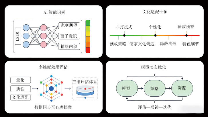 第三,证明四环联动闭环机制是心理健康干预可持续发展的有效方式,“AI智能识别—文化适配干预—多维度效果评估—模型动态优化”的架构,实现了干预全环节联动与持续改进,避免了碎片化管理,使各个环节能数据互通、结果互哺,形成良性循环,显著提高了干预精准度和运行效率,保证了心理健康干预的长效性。