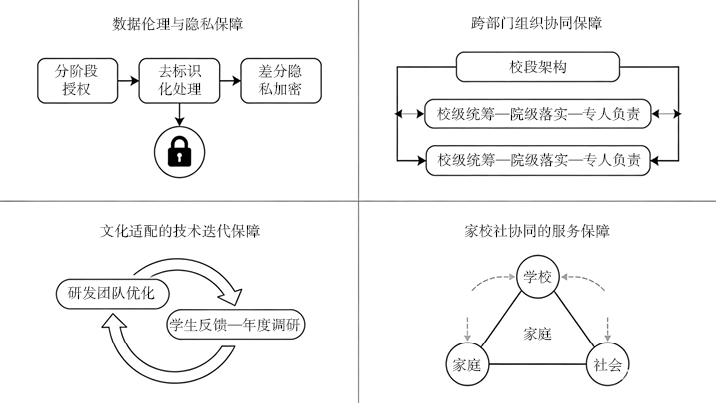 为保证AI赋能的文化特质导向分级干预闭环机制长久稳定运行,本研究以课题成果为依托,结合试点实践问题,构建数据伦理与隐私保障、跨部门组织协同保障、文化适配的技术迭代保障、家校社协同的服务保障四个维度的保障体系,从数据、组织、技术、服务四个方面提供全方位支撑,为机制推广提供可以复制的保障方案。