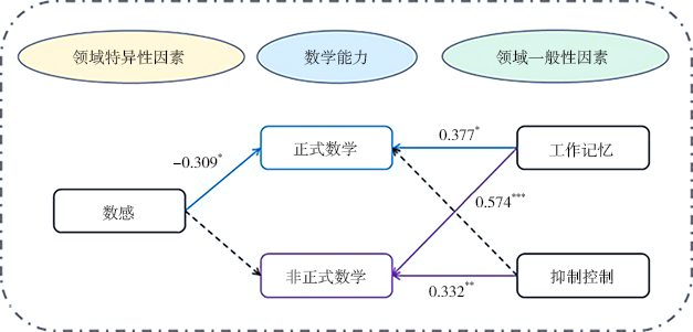 如图1所示,上述结果表明一般认知因素对非正式数学能力的解释力较强,而数感仅对正式数学能力具有独特预测作用。