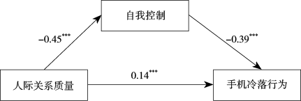 -0.45,p<0.001)。第三步,人际关系质量和自我控制为自变量,手机冷落行为为因变量,结果表明,人际关系质量(β=0.14,p<0.001)和自我控制(β=